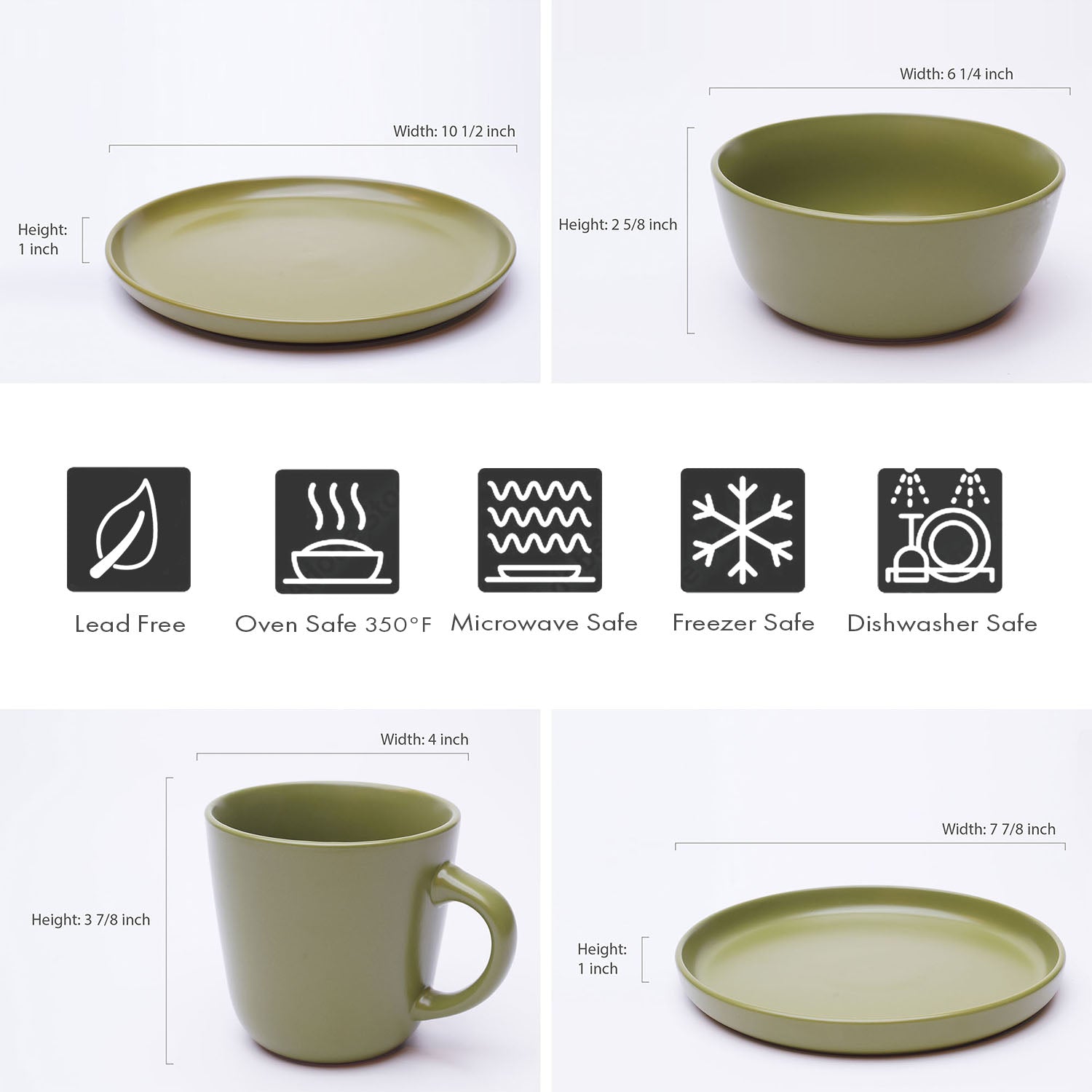 - 【Set includes】This Olive Green dinnerware set for 4 includes 4*10” dinner plates, 4*8” salad plates, 4*4" mugs and 4*6.25” cereal bowls. This is a great combination for a family dinner party.